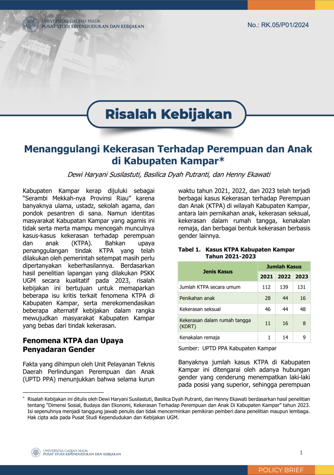 Risalah Kebijakan, PSKK UGM – Pusat Studi Kependudukan dan Kebijakan (PSKK) UGM menerbitkan Risalah Kebijakan atau Policy Brief bertajuk, “Menanggulangi Kekerasan Terhadap Perempuan dan Anak di Kabupaten Kampar”. Kabupaten Kampar kerap dijuluki sebagai “Serambi Mekkah-nya Provinsi Riau” karena banyaknya ulama, ustadz, sekolah agama, dan pondok pesantren di sana. Namun identitas masyarakat Kabupaten Kampar yang agamis ini tidak serta merta mampu mencegah munculnya kasus-kasus kekerasan terhadap perempuan dan anak (KTPA). Bahkan upaya penanggulangan tindak KTPA yang telah dilakukan oleh pemerintah setempat masih perlu dipertanyakan keberhasilannya. Berdasarkan hasil penelitian lapangan yang dilakukan PSKK UGM secara kualitatif pada 2023, risalah kebijakan ini bertujuan untuk memaparkan beberapa isu kritis terkait fenomena KTPA di Kabupaten Kampar, serta merekomendasikan beberapa alternatif kebijakan dalam rangka mewujudkan masyarakat Kabupaten Kampar yang bebas dari tindak kekerasan.